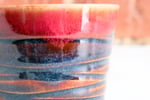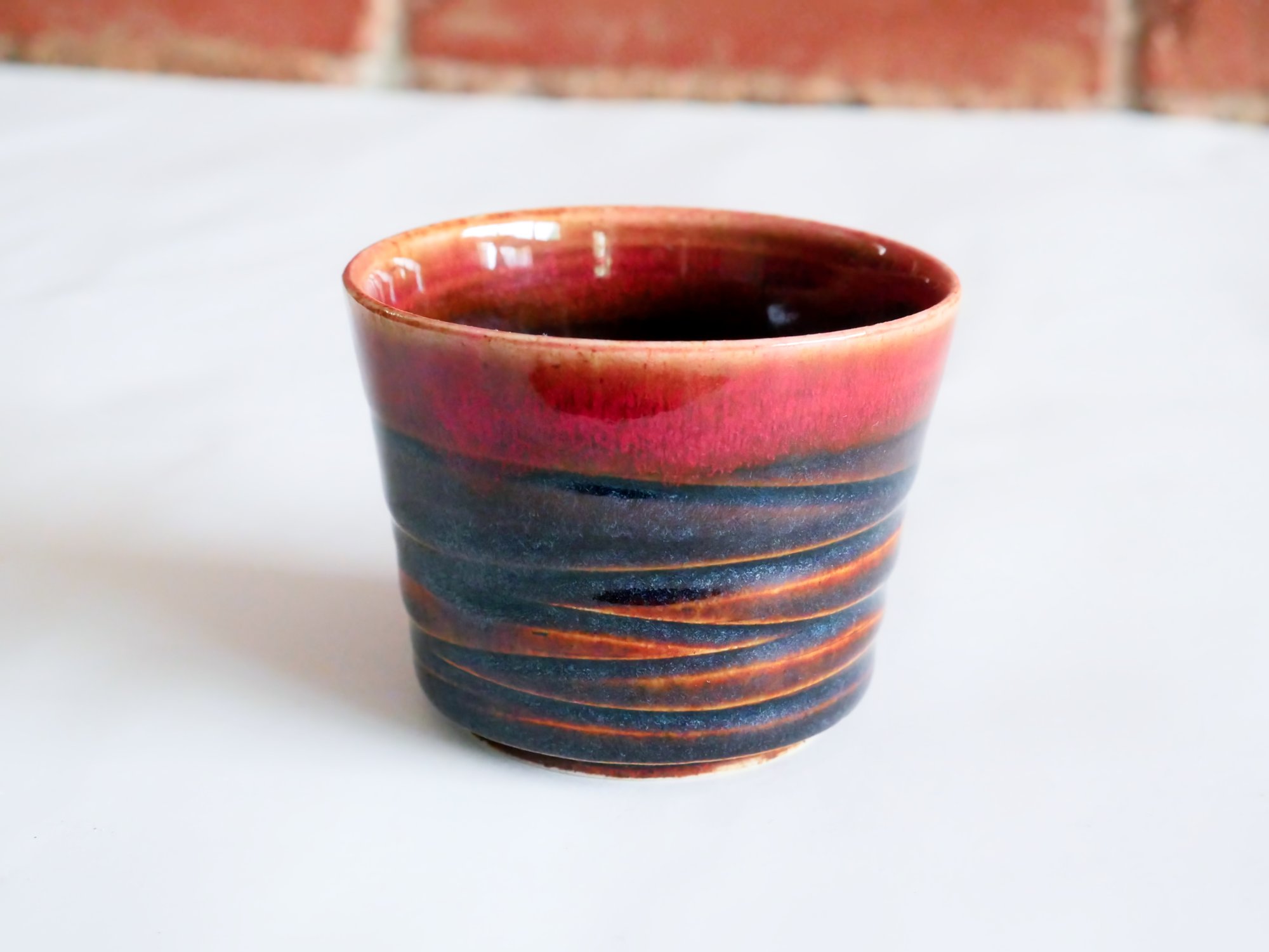 These cups are great for espresso, tea, sake, or your drink of choice. White clay glazed with a red rim that seeps into floating galactic deep blue and glows orange at points over a grooved texture. Sold individually.