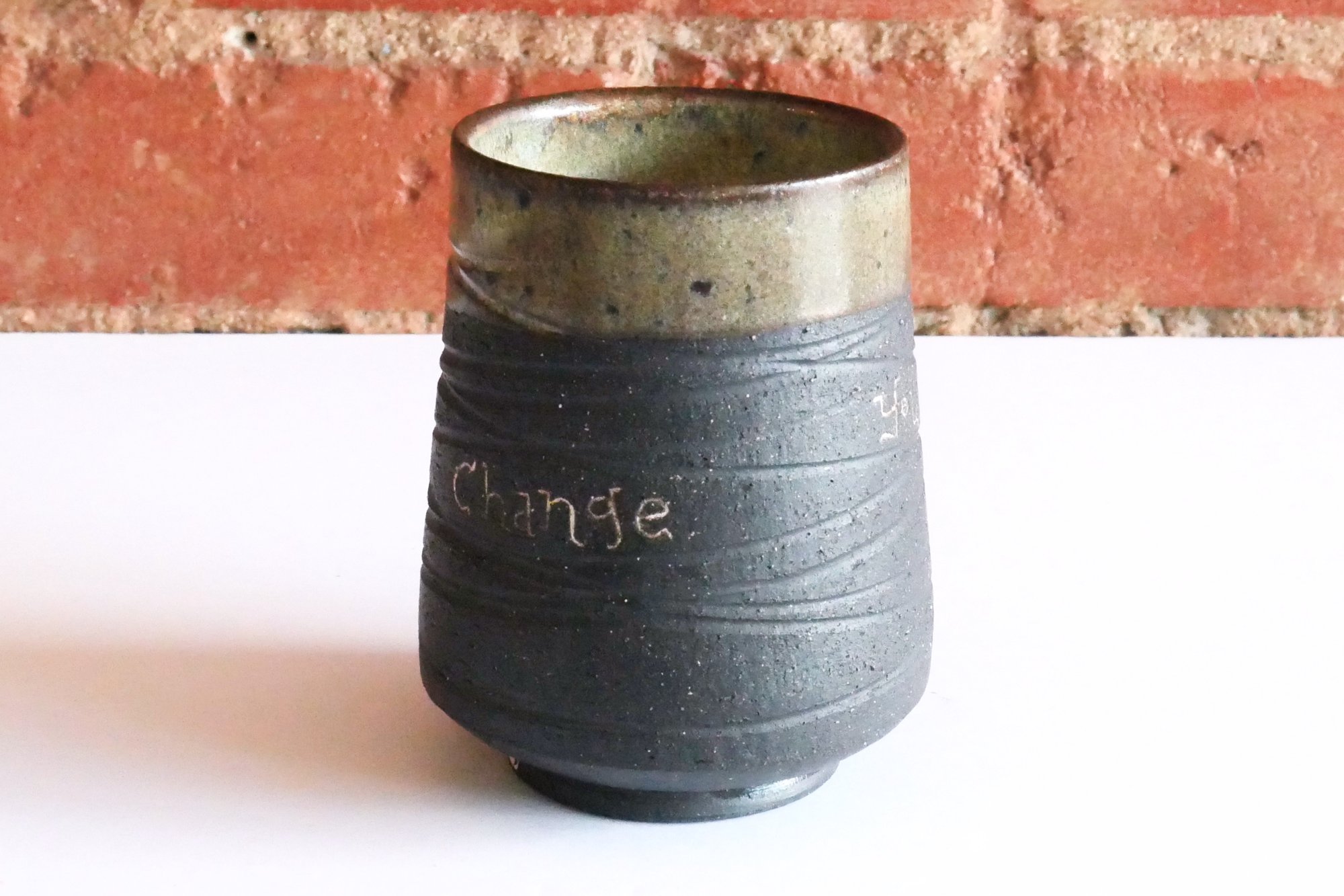These tumblers are great for an espresso drink or cup of tea. An inset foot and rounded base leads to inward-sloping walls and deep texture on the raw black clay exterior, with lines of carved and inlayed white arrows pointing where the grooves run through. An organic brown-to-gray glaze over the rim and inside reveals specks of blue. Hand-carved lettering with a white inlay says "change your gender".