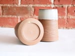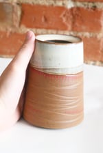 Bud vases with a wide base and conic walls sloped in, then a sharply inset lip that dips below the outer rim. The base of the piece is raw red-brown clay, with a grooved texture, and scattered lines of little red arrows. The top few inches, inset rim, and inside have an icy white/gray gloss glaze. Sold individually.