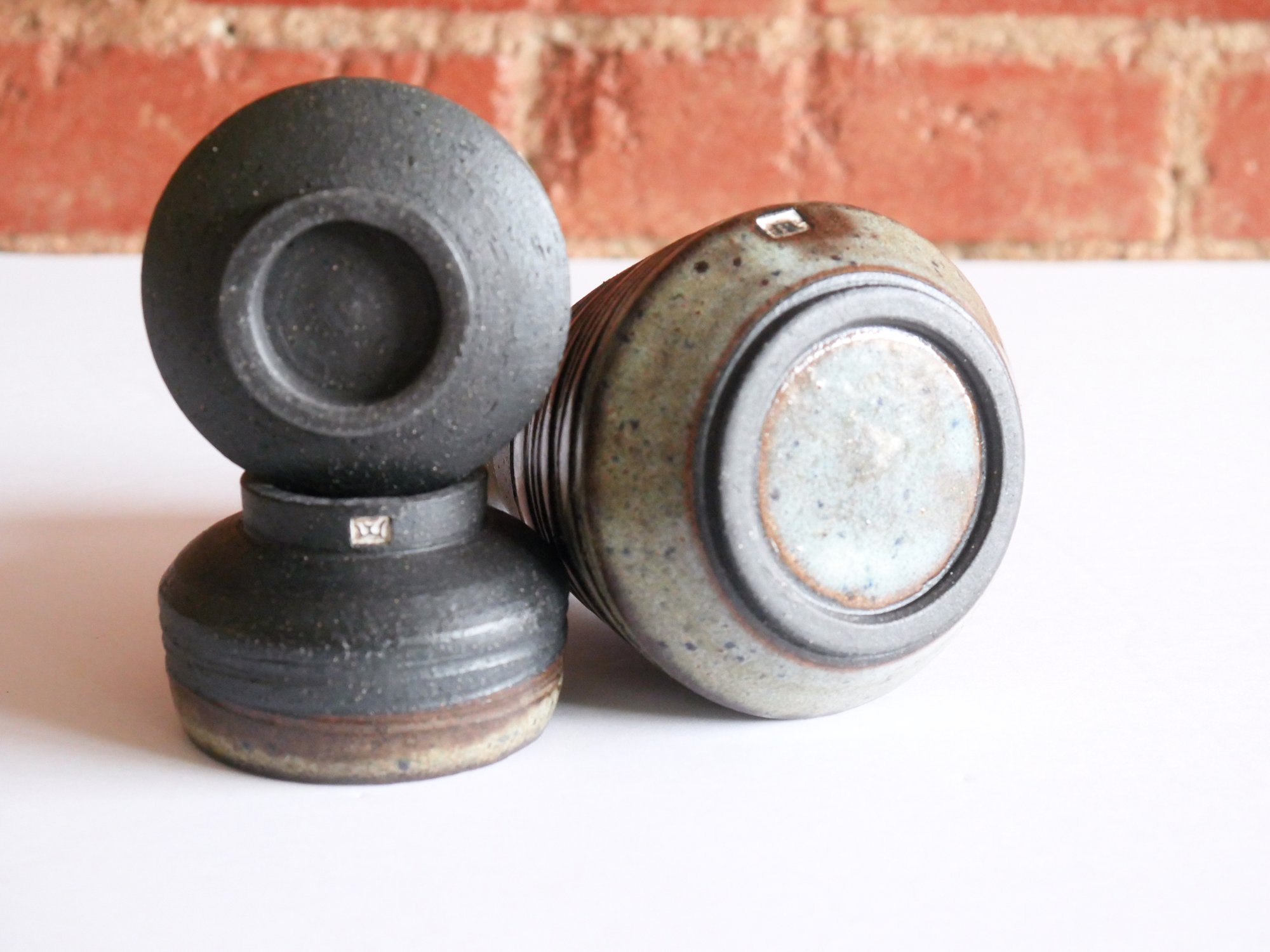 Espresso-sized cups with a deep foot, wide, and inward-angled walls. These little guys feel rough and natural, and a pleasure to sip from. (sake bottle sold separately)