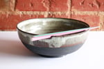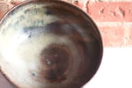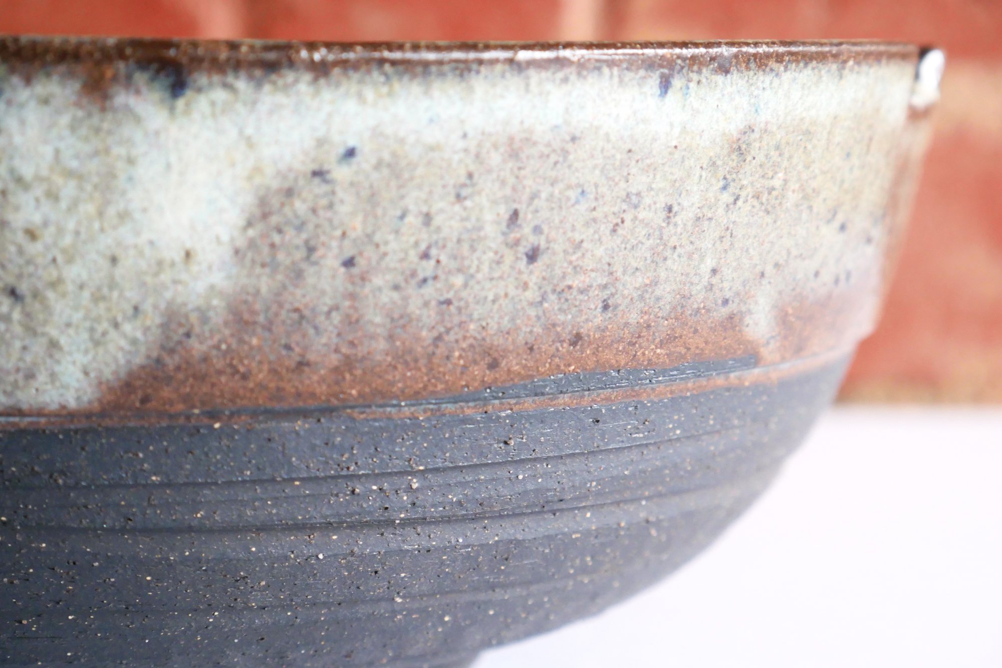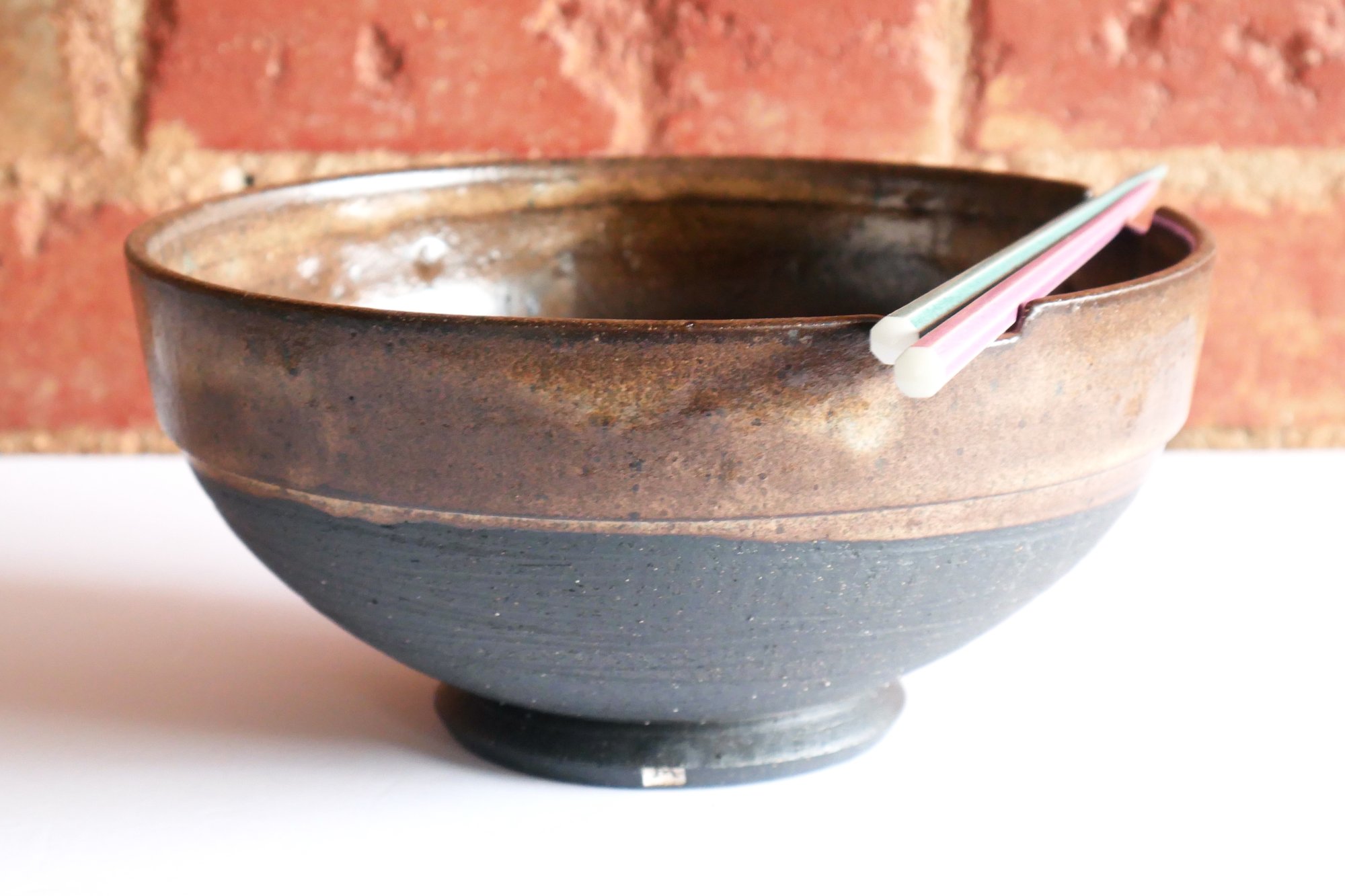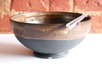 If you like a large soup or noodle dinner, you'll love these large notched bowls. We order the spicy vegetarian Pho from our favorite place on south Federal in Denver. These black ironstone bowls have a deep angular foot ring, and round textured belly leading to a wide rim with organic brown glaze that continues inside with splashes of blue.