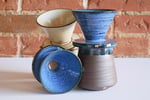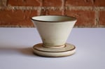 Coffee pour-over designed for v60 filters. A clean geometric cone shape with grooved texture on a flat disc base. The underside is designed to direct the dripping coffee, and keep the dripper in place over a mug. Sold individually, tumblers are separate.