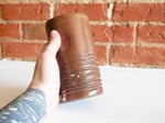 A pint-glass that could easily cary your beer or a bouquet of flowers. The cylinder shape has textured rings near the base, and a thumbprint indent on each side, finished in a redwood matte glaze with organic texture and a splash of white near the base. Does it cary flowers, or something to drink? Only you can decide.