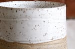 An inset foot and rounded base leads to inward-sloping walls and deep texture on the speckled tan clay exterior, with lines of painted white arrows pointing where the grooves run through. A white glaze at the rim and inside allows the speckles to show through.
