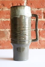 What if you could have an iconic 30oz Stanley Quencher, with that narrow cupholder-friendly foot, but hand made and one-of-a-kind? Stay hydrated, or use it as a vase. A travel vase?! This one is made from black clay with an inch-plus rim of white foam dripping into a mossy green – and grooved carvings at the base of the wide section.