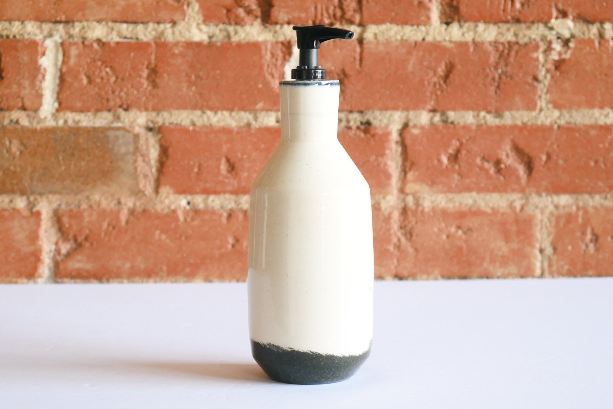 A black ironstone base transitions sharply to an off-white with gentle specks for this angular bottle-shaped soap dispenser. The belly has a subtle curve, then cuts in at the shoulder, and flares again slightly at the neck to a black-glazed rim and interior, with a black stopper and pump.