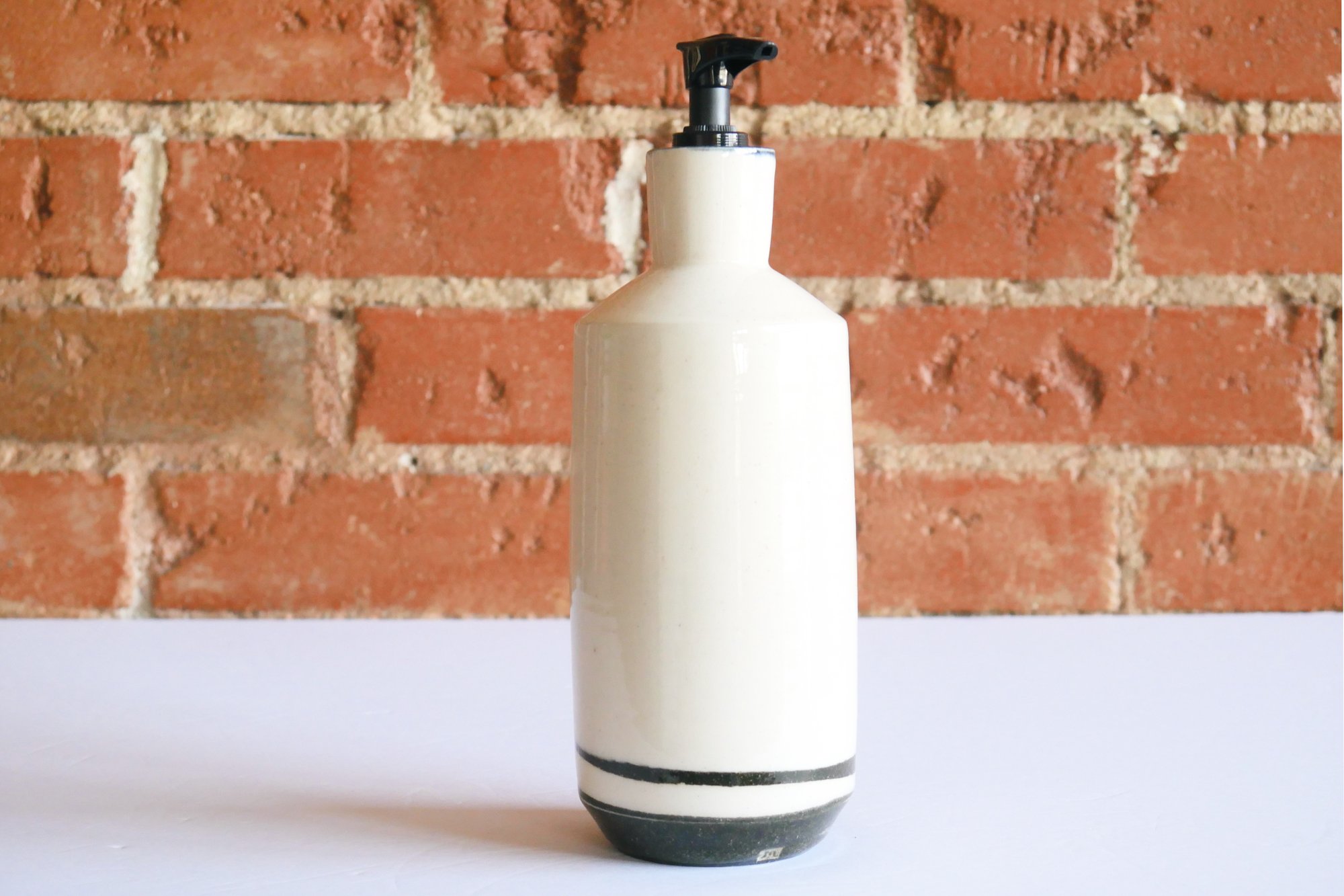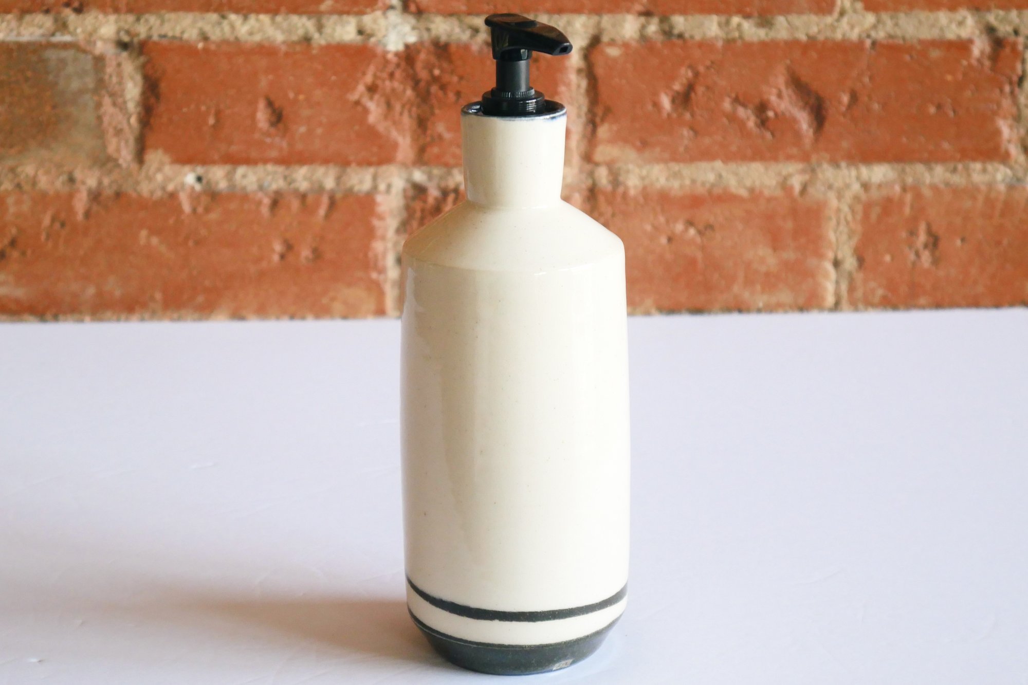 A black ironstone base transitions sharply to an off-white with gentle specks for this angular bottle-shaped soap dispenser. The belly has a subtle curve, then cuts in at the shoulder, and flares again slightly at the neck to a black-glazed rim and interior, with a black stopper and pump.
